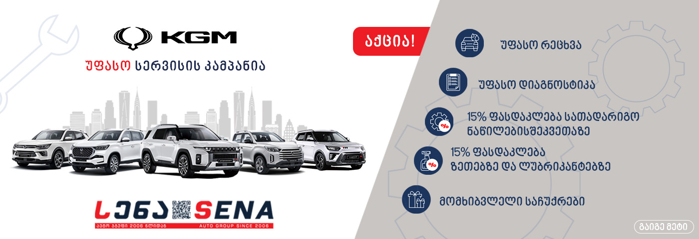 სენა ავტო ჯგუფი, KGM-ის ოფიციალური დისტრიბუტორი საქართველოში, ახორციელებს სანგიონგის ავტომობილების ავტორიზებულ ტექნიკურ მომსახურებასა და შეკეთებას: